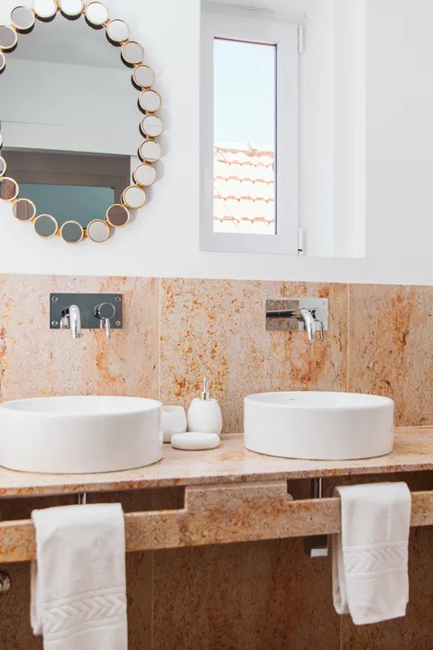 En las plantas superiores, se puede disfrutar de impresionantes vistas sobre el río Tejo y los pintorescos tejados de la ciudad, mientras que en la planta baja, un apartamento con jardín privado ofrece un refugio romántico.